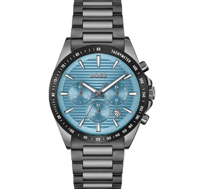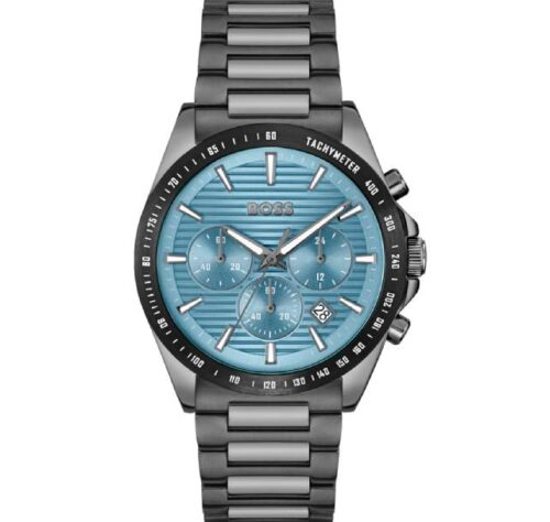 Ανδρικό ρολόι Boss, από ανοξείδωτο ατσάλι χρώμα ανθρακί. Χρονογράφος με μπλε καντράν. Αδιάβροχο στα 50m, το μέγεθος της κάσας του είναι στα 41mm.