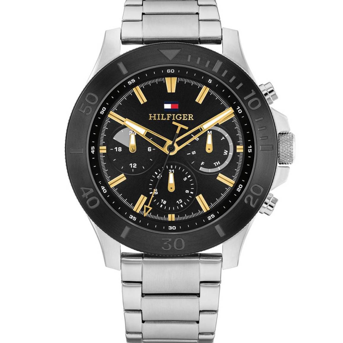 Ανδρικό ρολόι Tommy Hilfiger χρονογράφος από ανοξείδωτο ατσάλι. Μπρασελέ με μαύρο καντράν. Αδιάβροχο στα 50m, ακατάλληλο για κολύμβηση και το μέγεθος της κάσας του είναι στα 46mm.