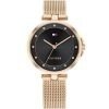 Γυναικείο ρολόι Tommy Hilfiger, από ανοξείδωτο ατσάλι σε ροζ επίχρυσο, με φίνο μπρασελέ mesh και ζιργκόν στο μαύρο του καντράν. Αδιάβροχο στις 3 atm.