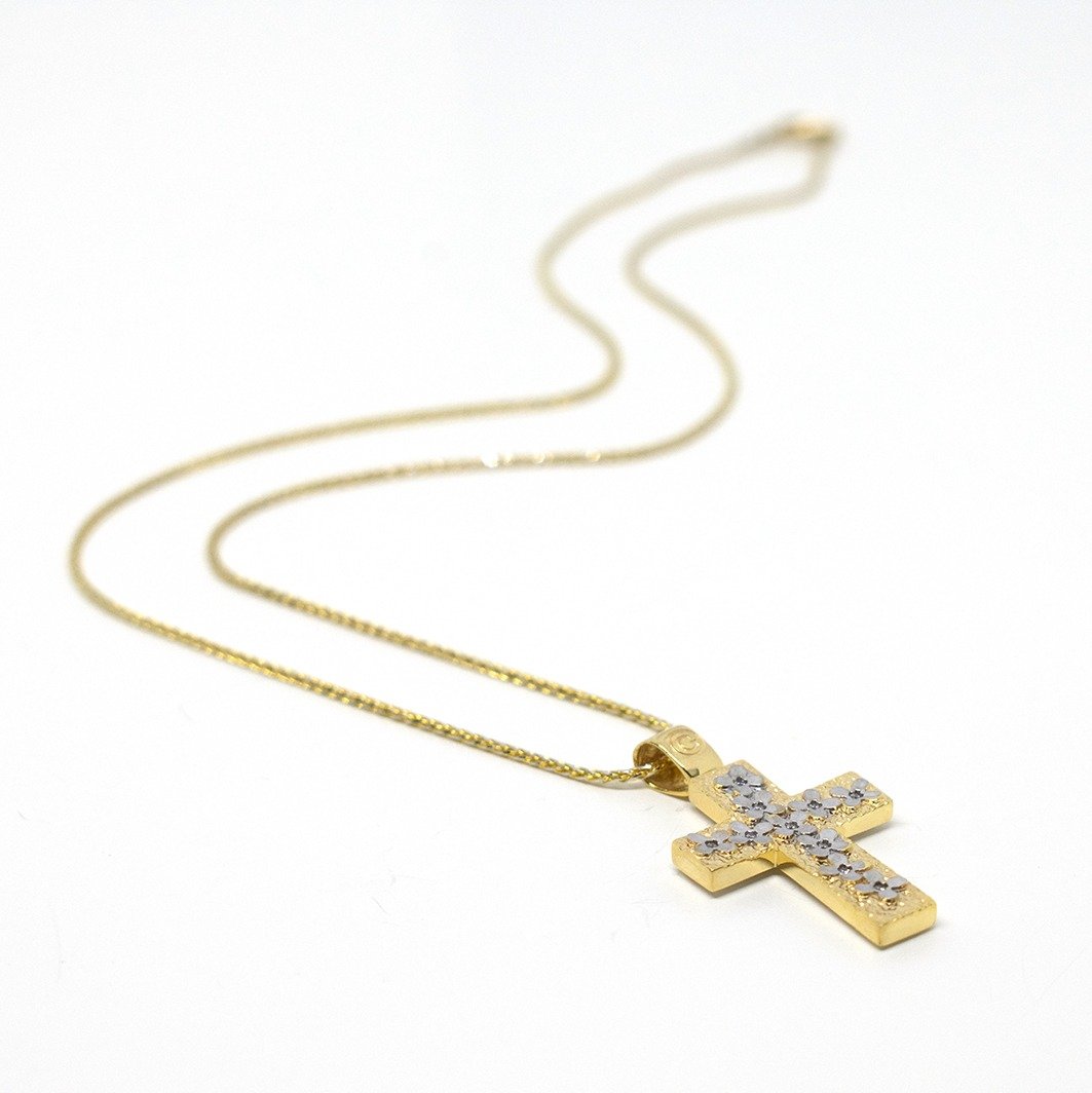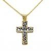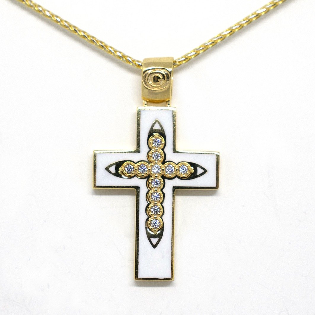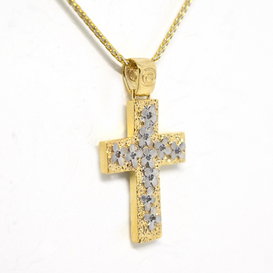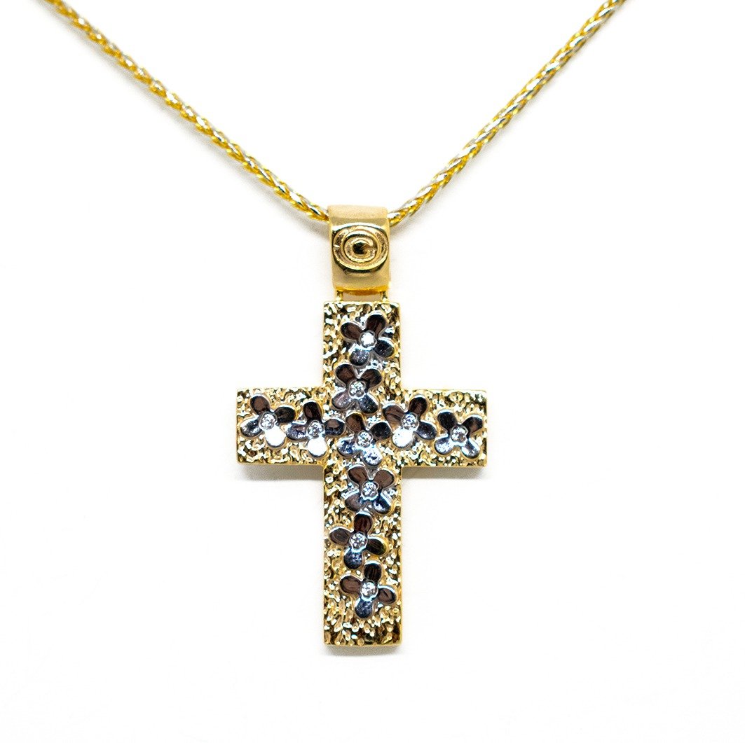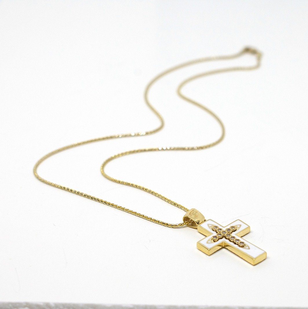 Ένας εντυπωσιακός σταυρός δυο όψεων που αποτελείται από κίτρινο χρυσό είναι διακοσμημένος με υπέροχα αστραφτερά ζιργκόν για να χαρίσει λάμψη στο ντεκολτέ σας στη στιγμή. Αυτός ο χαρακτηριστικός σταυρός αξίζει σίγουρα να γίνει το σήμα κατατεθέν σας.