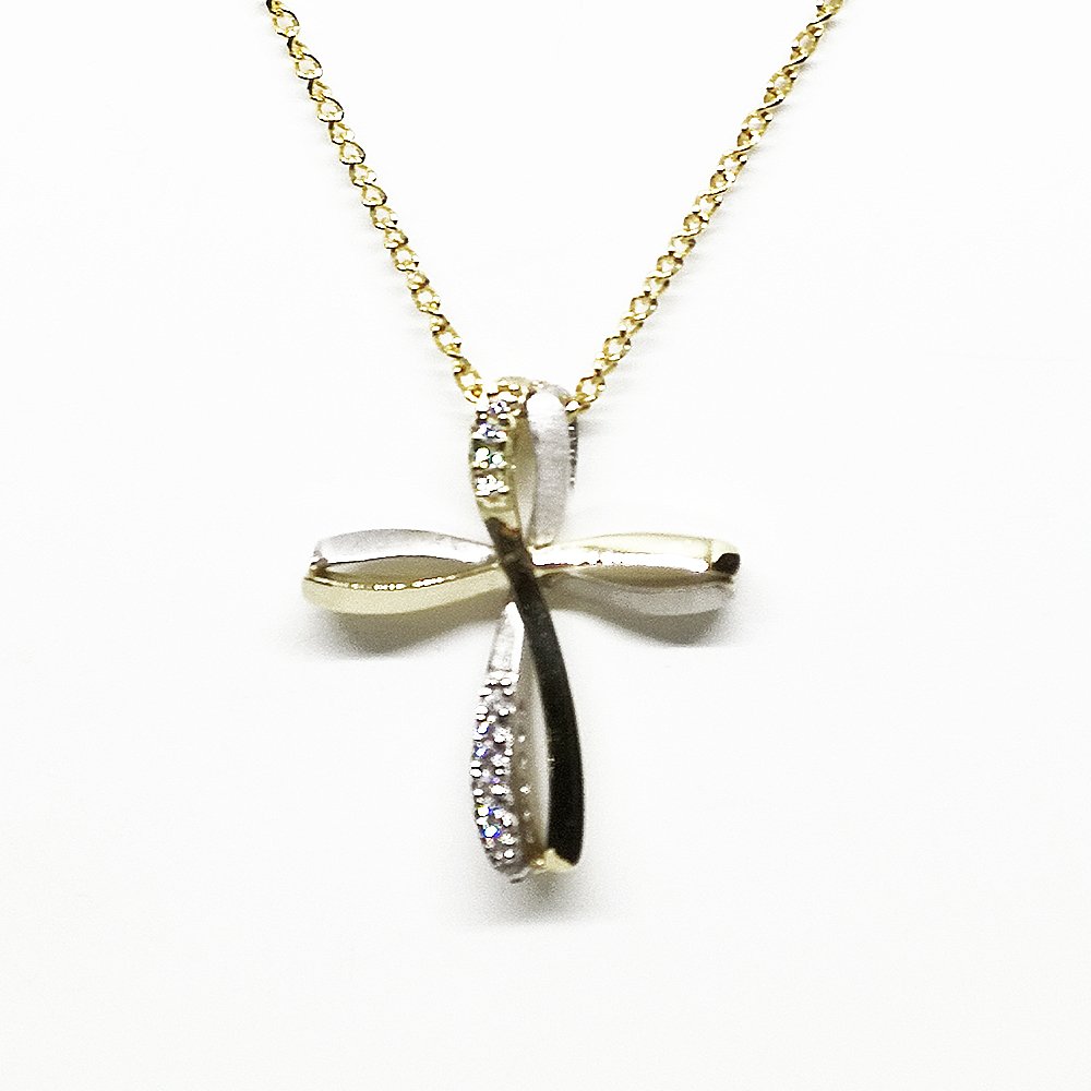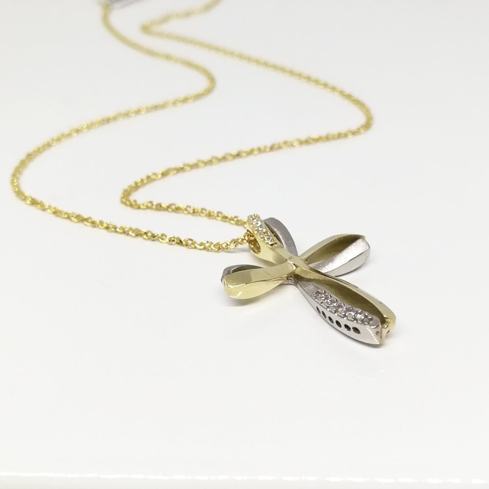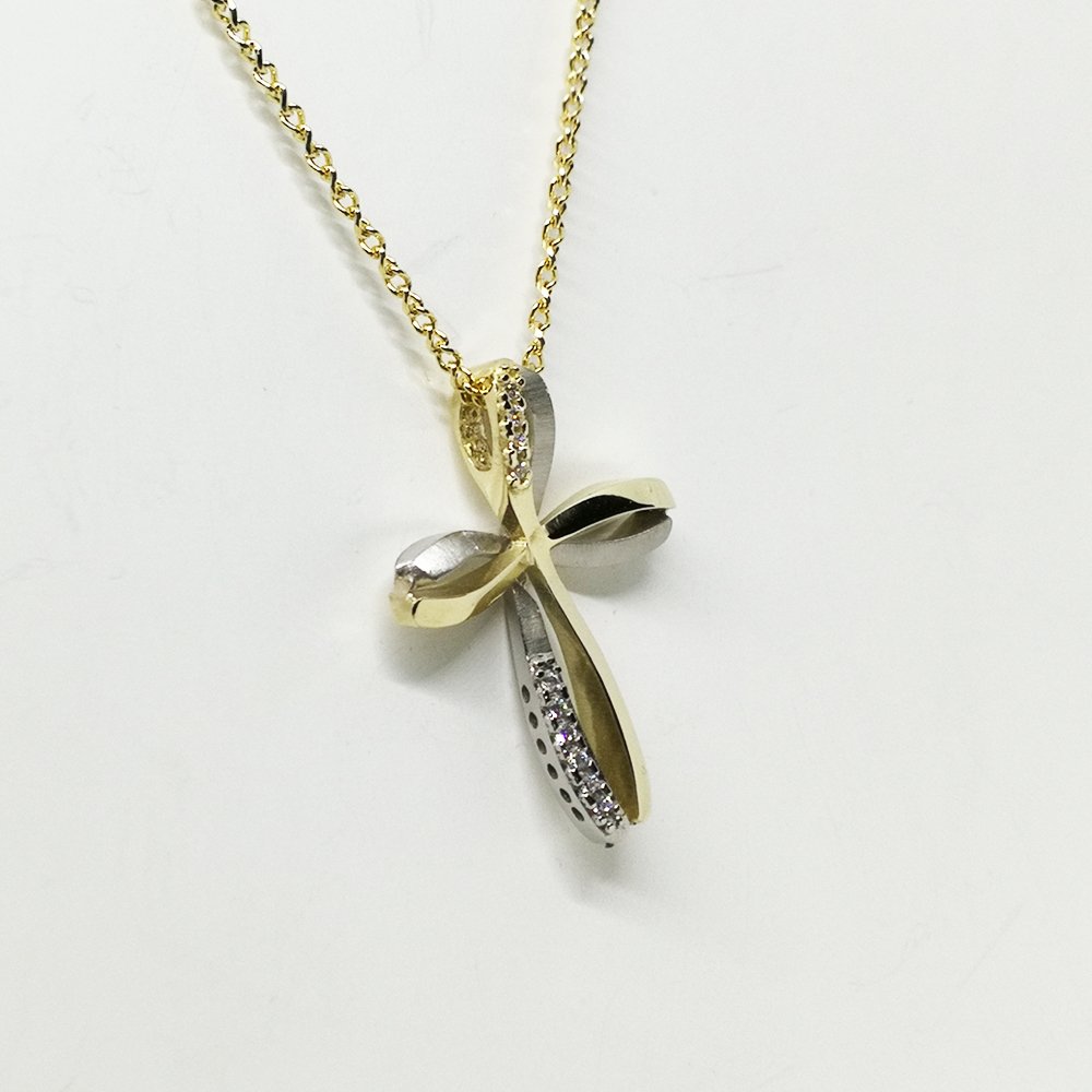 Ένας λεπτός και διακριτικώς  σταυρός με ιδιαίτερο σχεδιασμό  που αποτελείται από κίτρινο & λευκό  χρυσό είναι διακοσμημένος με υπέροχα αστραφτερά ζιργκόν για να χαρίσει λάμψη στο ντεκολτέ σας στη στιγμή. . Αυτός ο χαρακτηριστικός σταυρός αξίζει σίγουρα να γίνει το σήμα κατατεθέν σας.